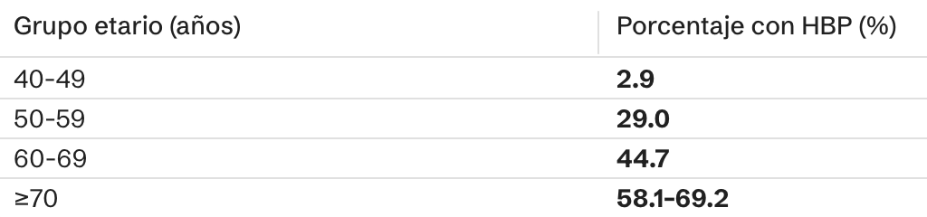 3.- Aproximadamete un 20 % de los varones entre los 40 a 50 años presentarán Crecimiento Benigno de la Próstata, pudiendo estas cifras elevarse incluso a un 50 % a los 60 años y hasta un80 % en varones sobre los 80 años. En la tabla, porcentaje de varones con HBP según grupo etario.
