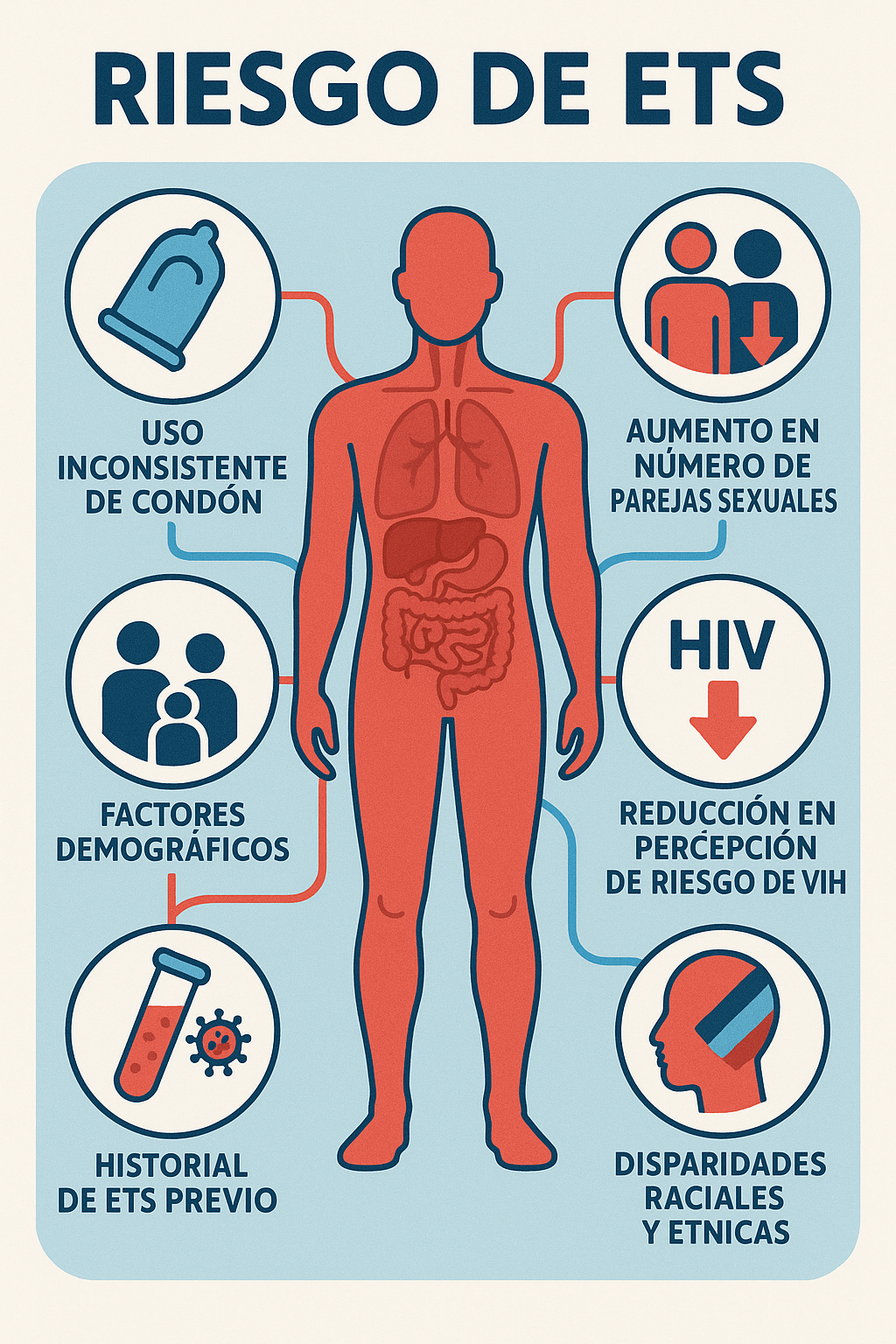 5. Factores sociodemográficos: La edad joven, el uso de aplicaciones de citas y la falta de acceso a servicios de salud sexual son factores adicionales que aumentan el riesgo de ETS.[3][7]