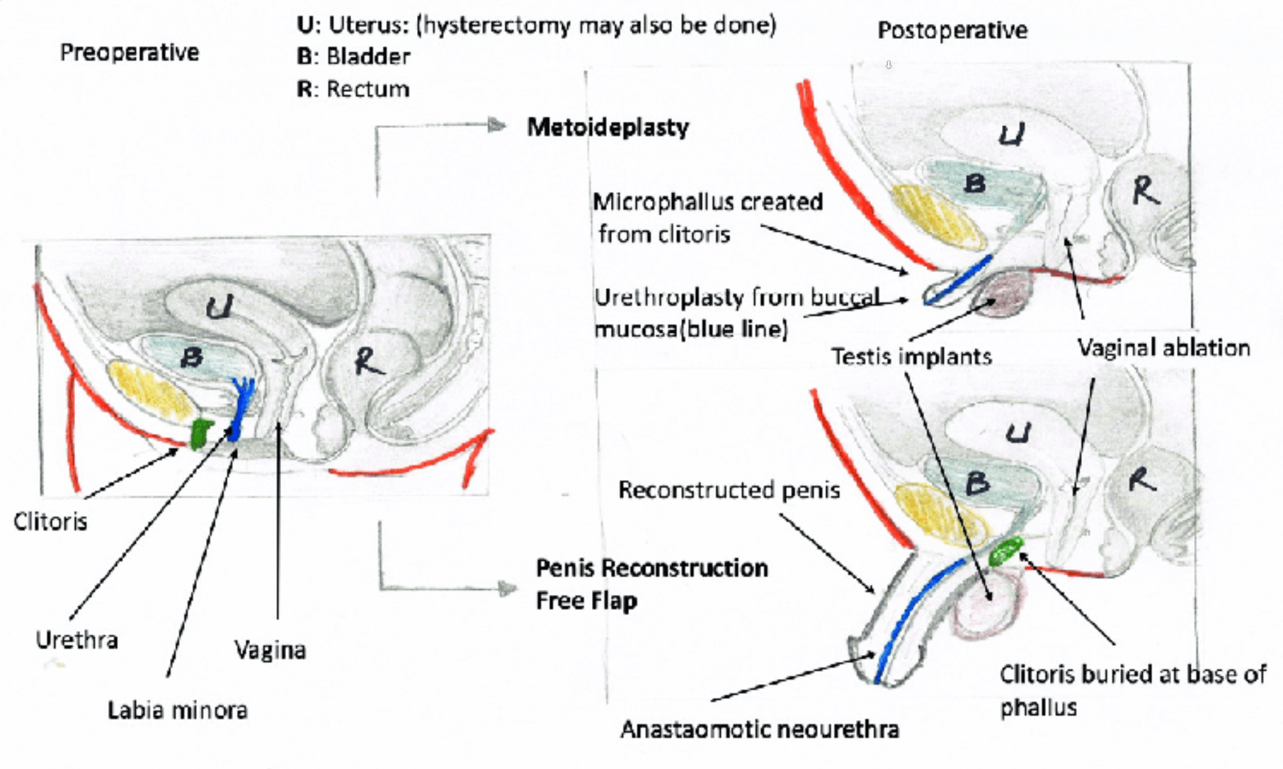 Planteamiento quirúrgico: La terapia hormonal agrandará el clítoris el cual se colocará a la base el "nuevo" falo. La uretra se alargará bajo un proceso complejo para que abarque toda el "nuevo" pene.
