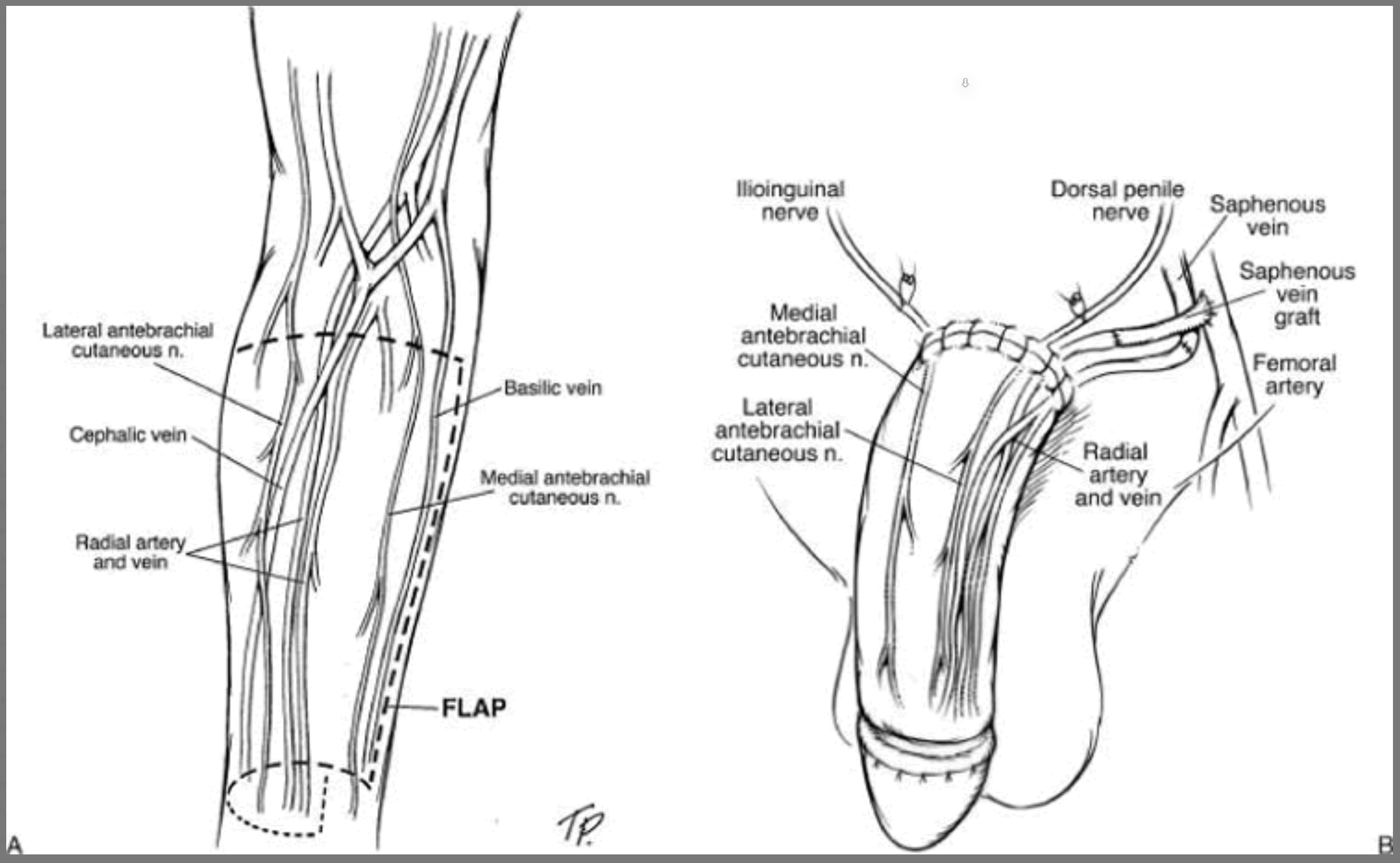 El "nuevo" falo se realiza de un colgajo de antebrazo, muslo o abdomen. En el lado izquierdo de la imagen se observa el muslo de la persona y en el lado derecho su implantación en la zona genital como un nuevo falo.
