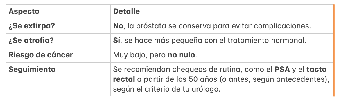 Aunque pueda parecer contradictorio, la próstata se conserva por motivos de seguridad y salud, y no afecta el resultado estético o la identidad de género.